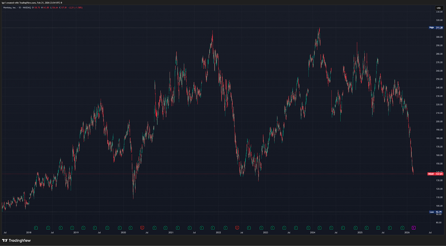 Since the start of 2026, Workday is down ~30% due largely to AI fears. The stock is back to price levels not seen since the bottom of the 2022 bear market and the depths of the COVID crash.