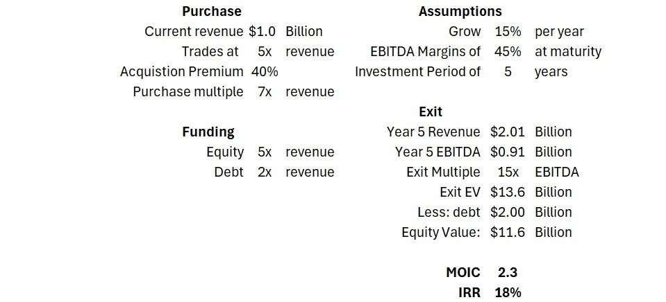 In October 2025, we got a sneak peek into how the biggest private SaaS investor, Thoma Bravo, thinks about their buyout model. On the All-in podcast, Orlando Bravo alluded to 45% normalized EBITDA margins for SAAS companies that they’ve bought. Here is a basic outline of the model described in the podcast: